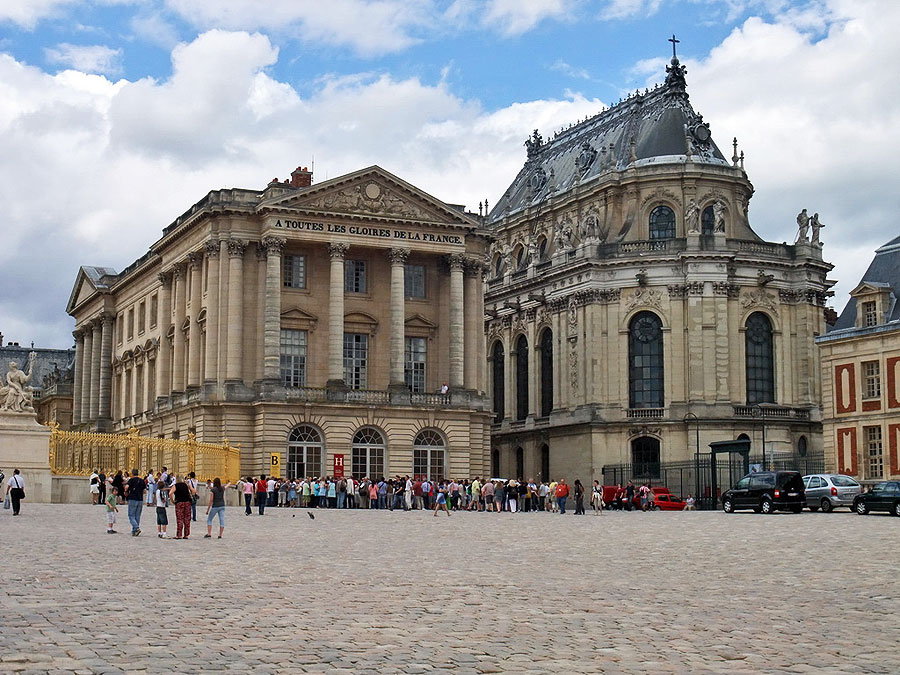 Пятая Часовня Версальского дворца (Chapelle du château de Versailles). Фасад часовни резко контрастирует с ровными геометрическими линиями фасада дворца. Таким было желание короля XIV.