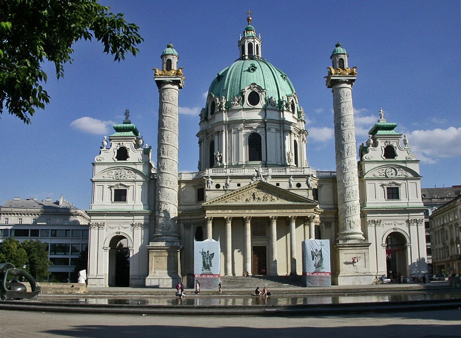 В 1713 году, во время чумы, император Карл VI дал обет построить храм своему небесному патрону. Был объявлен конкурс на лучший проект церкви, в результате которого был отобран проект Фишера. Церковь получила название Карлскирхе, что значит «Карлова церковь». Фишер приступил к работам в 1716 году. Вид этого сооружения должен был соответствовать идее величия империи Габсбургов. В архитектурном плане храма соединены в единое целое колонны древнеримского стиля, портик греческого стиля, барочные павильоны и купол, который установлен на барабане овальной формы. На стоящих у входа огромных колоннах можно увидеть спиралеобразно поднимающийся рельеф с изображением сцен из жизни св.Карла. Церковь Карлскирхе (Wiener Karlskirche) воздвигнута на честь императора Австрии Карла VI, 1713-1737гг.