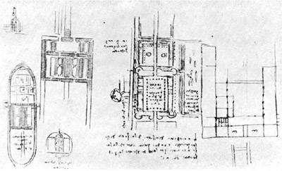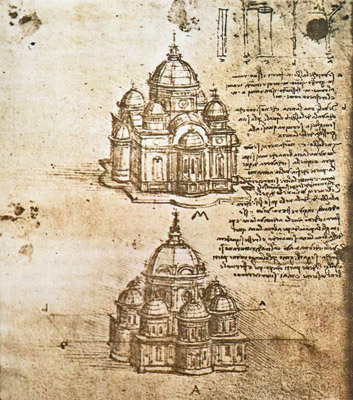 По всей видимости, именно эта задача сподвигла мастера обратить пристальное внимание на проектирование центрических купольных зданий, в эскизах которых мы можем увидеть реализацию множества новаторских художественных и технических решений. Некоторые исследователи считают, что знаменитый архитектор Браманте при создании своего самого грандиозного проекта (собор св. Петра) использовал некоторые из этих идей да Винчи. 5-Leonardo_da_Vinci-Studies_of_Central_Plan_Buildings.jpg