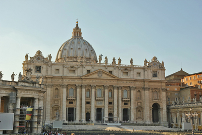Собор Святого Петра (Basilica di San Pietro, Ватикан). Первоначальный проект собора выполнил Браманте (с использованием чертежей Леонардо да Винчи), однако последующие перестройки в значительной мере изменили его архитектонику